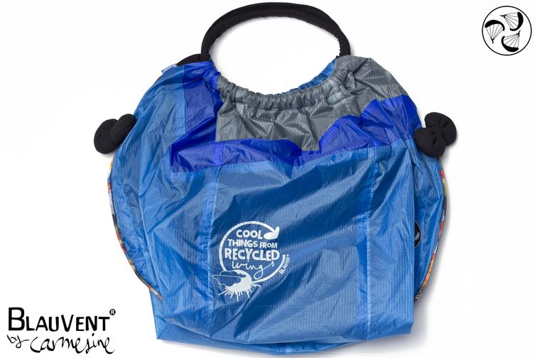 La Bossa DRAPED, reciclada, està fabricada amb l'extradors del parapent, resistent a l'aigua i al vent. Folrada amb teixit gros de loneta, ofereix una gran durabilitat i resistència. Els seus mànecs tubulars, blans i ergonòmics, permeten dur la bossa en el muscle o en la mà. Inclou al seu interior una cinta amb mosquetói de subjecció i una petita bossa de tancament amb cremallera de 20cm x 14cm x 4cm, confeccionat amb teixit estampat de cotó, disseny exclusiu de Blauvent. És una bossa colorista, lleugera i chic per a dones actives i vitalistes que vulguen un producte personal que les defineixca. Realitzada a mà a Espanya!